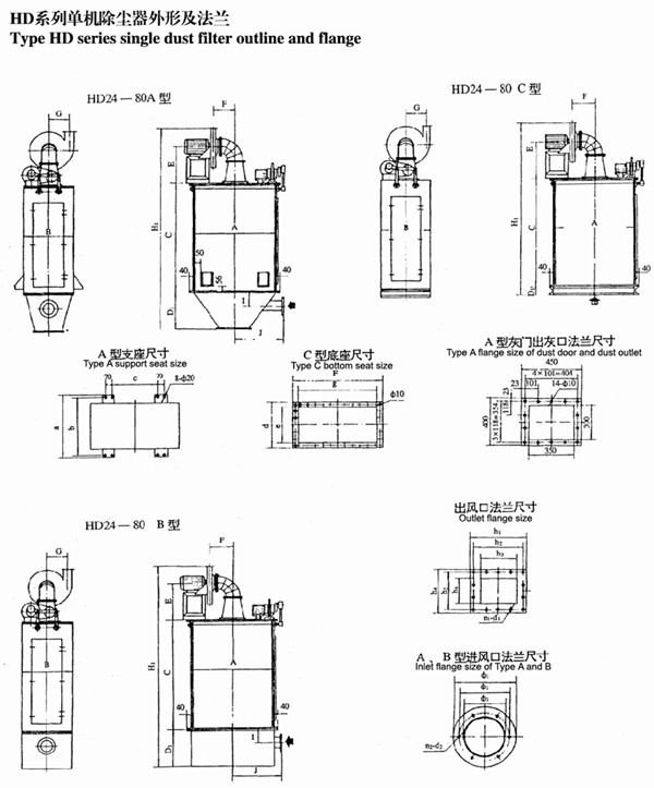 1、HD系列單機除塵器機組,安裝在產生粉塵的機械設備鄰近處,并由用戶按照除塵機組上進風 口尺寸,自行配制金屬或塑料吸塵管道和吸塵罩(亦可訂貨時與生產廠聯系,代為配制)。