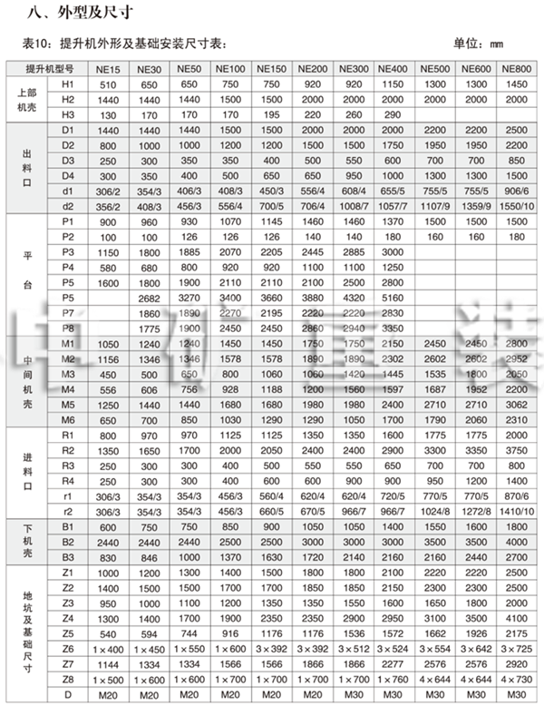 NE15、NE30、NE50、NE100、NE150、NE200、NE300、NE400型提升機(jī)的提升量、提升高度及動(dòng)力配備表見表2-9,選擇NE500、NE600、NE800型提升機(jī)時(shí),請(qǐng)與中礦公司技術(shù)部聯(lián)系,聯(lián)系人:周小姐,聯(lián)系電話:0513-88400999。